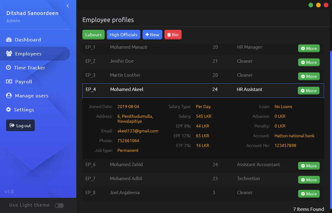 This is a payroll and employee management application. I've developed this application using Electron Js. This application allows to manage payroll, Employees, Loan, Advance, and lot more fetures. Also I have developed a hybrid mobile application to track employees working hours. Salary calculation is based on working hours whitch is tracked by the mobile app.