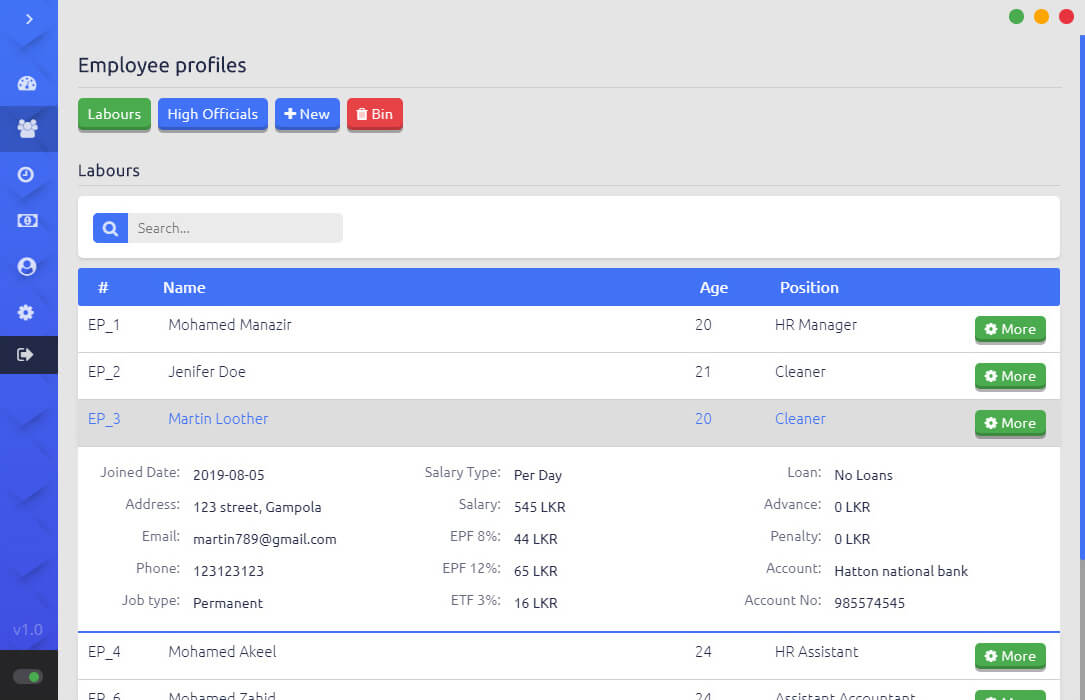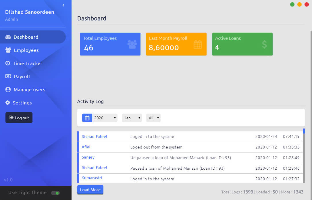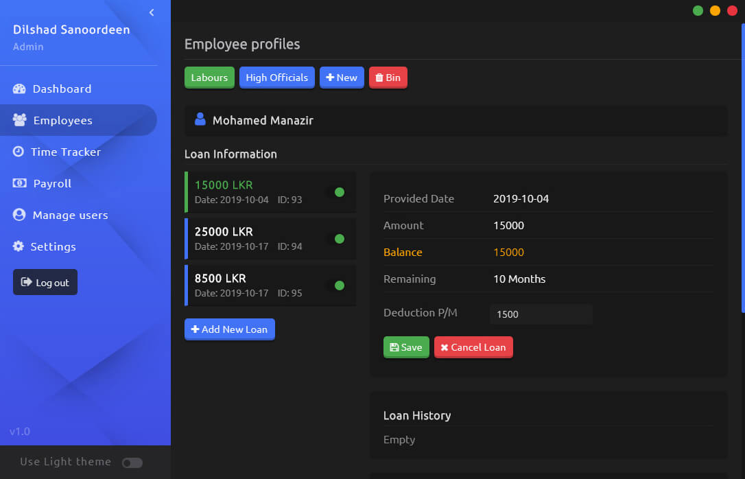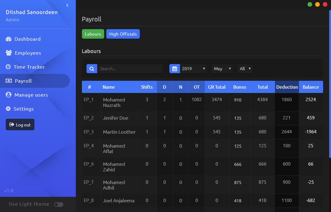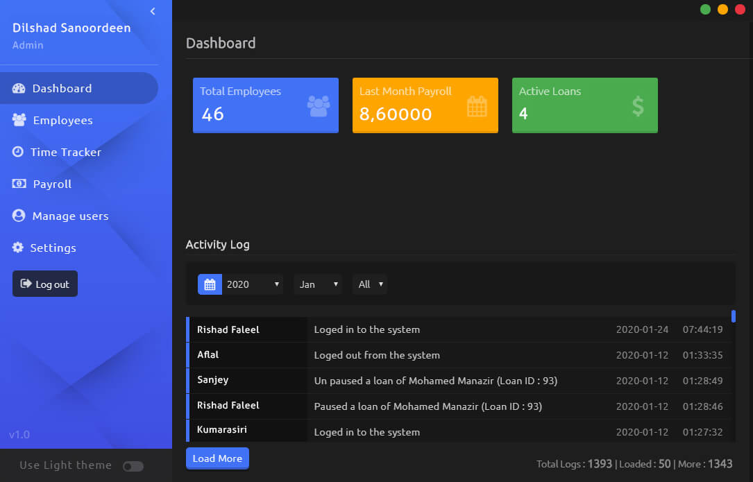 This is a payroll and employee management application. I've developed this application using Electron Js. This application allows to manage payroll, Employees, Loan, Advance, and lot more fetures. Also I have developed a hybrid mobile application to track employees working hours. Salary calculation is based on working hours whitch is tracked by the mobile app. Applications Front-end contains two themes (Dark/Light)